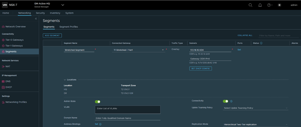 2- Create a global segment from the global manager, the segment would be stretched between the two sites HQ and DR:
