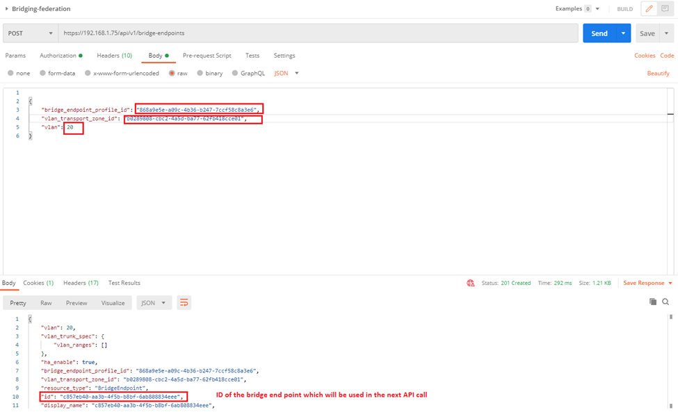 We can get the first two highlighted parameters from UI (bridge profile ID and VLAN TZ ID) and the third one is the VLAN ID of the VLAN which will be bridged to the stretched segment, the last one is the bridge end point which we use in a new API call it to create a port on the bridge