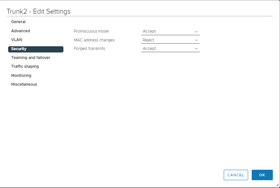 9-Enable Promiscuous mode and forged transmits on the trunk port that connects the edges used in the bridge profile ( to allow traffic to be sourced from different MAC without VDS blocking them)