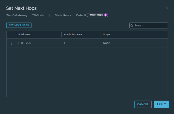 And Finally a default route was configured from T0 gateway pointing towards the Physical upstream device:
