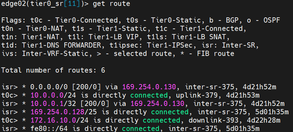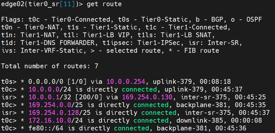 After correcting the uplink IP of Edge Node 2, you can see the default route in the routing table pointing to the physical device