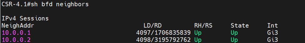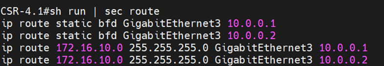 The static routes configured with BFD towards the edge nodes 1 and 2: