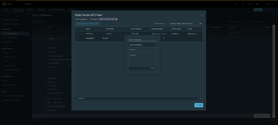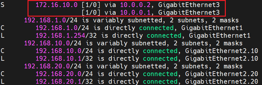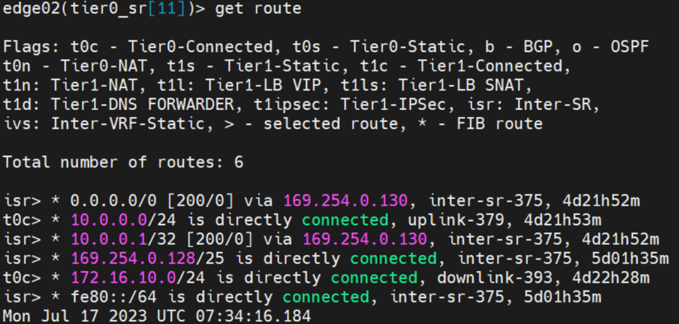 And finally the routing table which shows ECMP configuration of the static route pointing to the overlay segment in NSX: