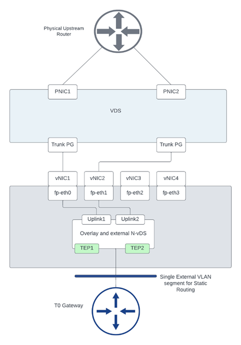In this blog, we’ll configure T0 with static routing and BFD with some failover scenarios while testing N/S reachability, the below diagram is the architecture we’ll reference in this blog post.