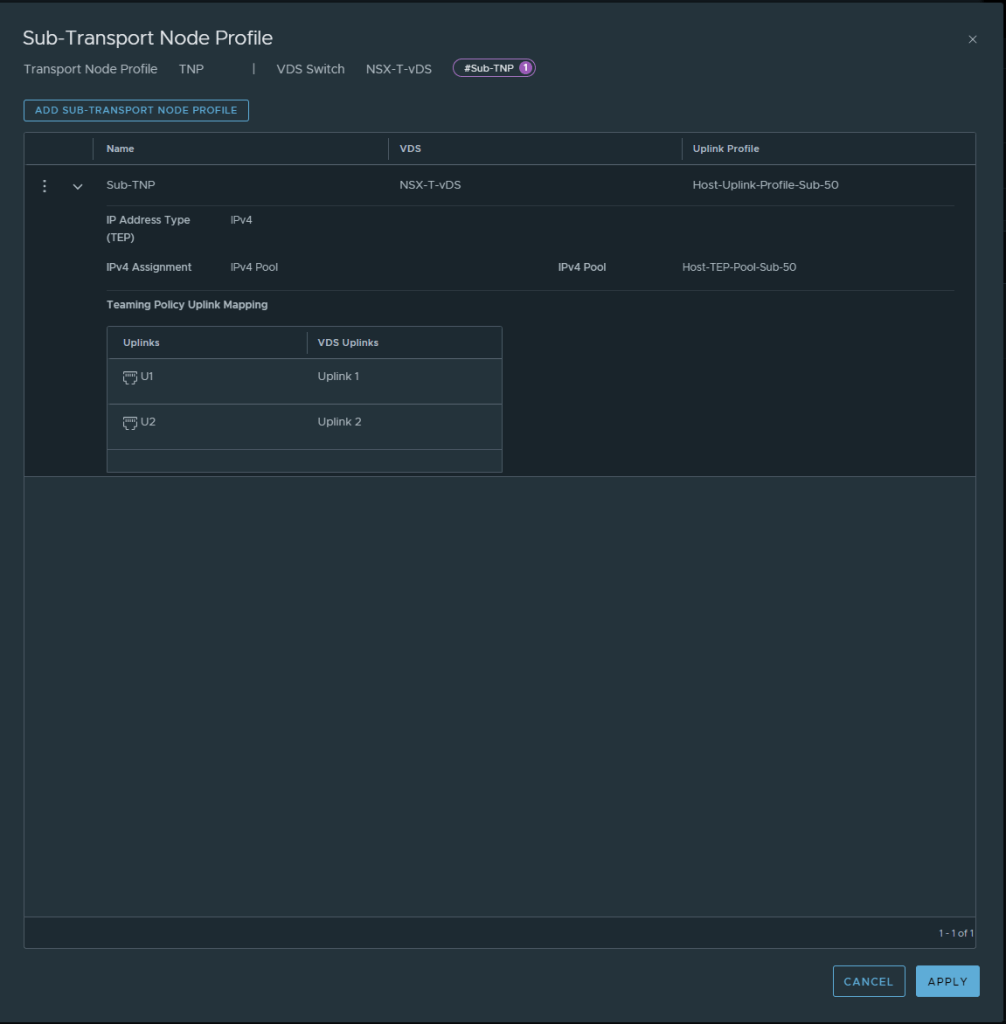 Sub-TNP is basically a template to be applied to Sub-Clusters to be prepared for NSX with a configuration different than the one used in one TNP , one use case is having ESXi hosts under the same clusters in different sites, however the host TEP network is not available/stretched across the two sites, in this case a Sub-TNP can be applied to the Sub-Clusters of the second site for instance with different host TEP which means different IP pools and a different VLAN, without affecting the overlay segment communication across the two stretched vSphere cluster.