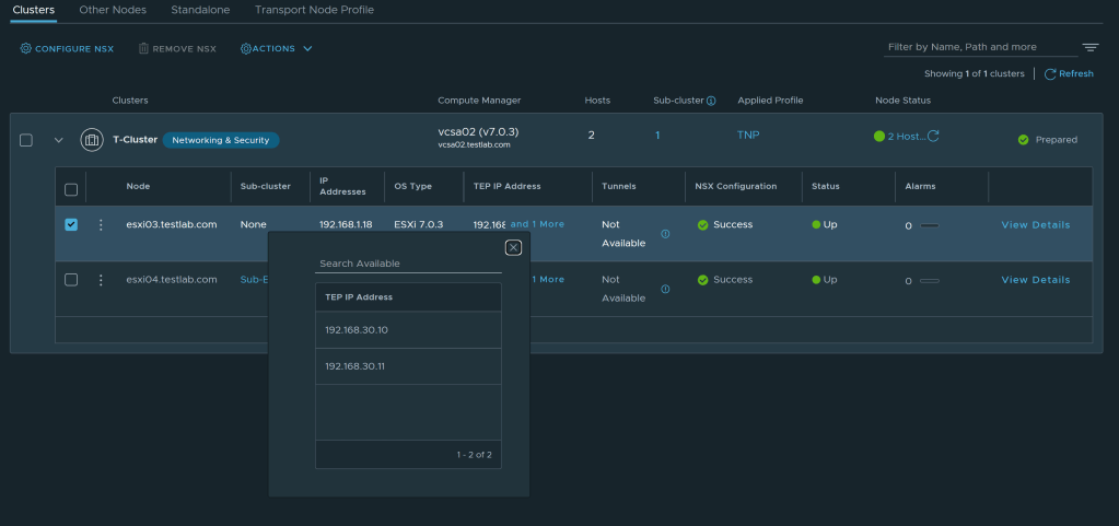 In this blog we’ll demonstrate that, I have a vSphere cluster with 2 ESXi hosts, esxi03 and esxi04, assuming that esxi04 is in a different site and the host TEP subnet used for esxi03 is not available at the second site, so we’ll create 2 different uplink profiles, 2 different IP Pools.