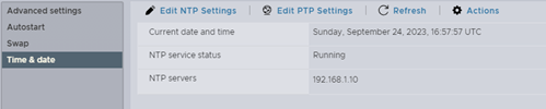 - Configure NTP on each host with the NTP server, and configured service to start/stop with host